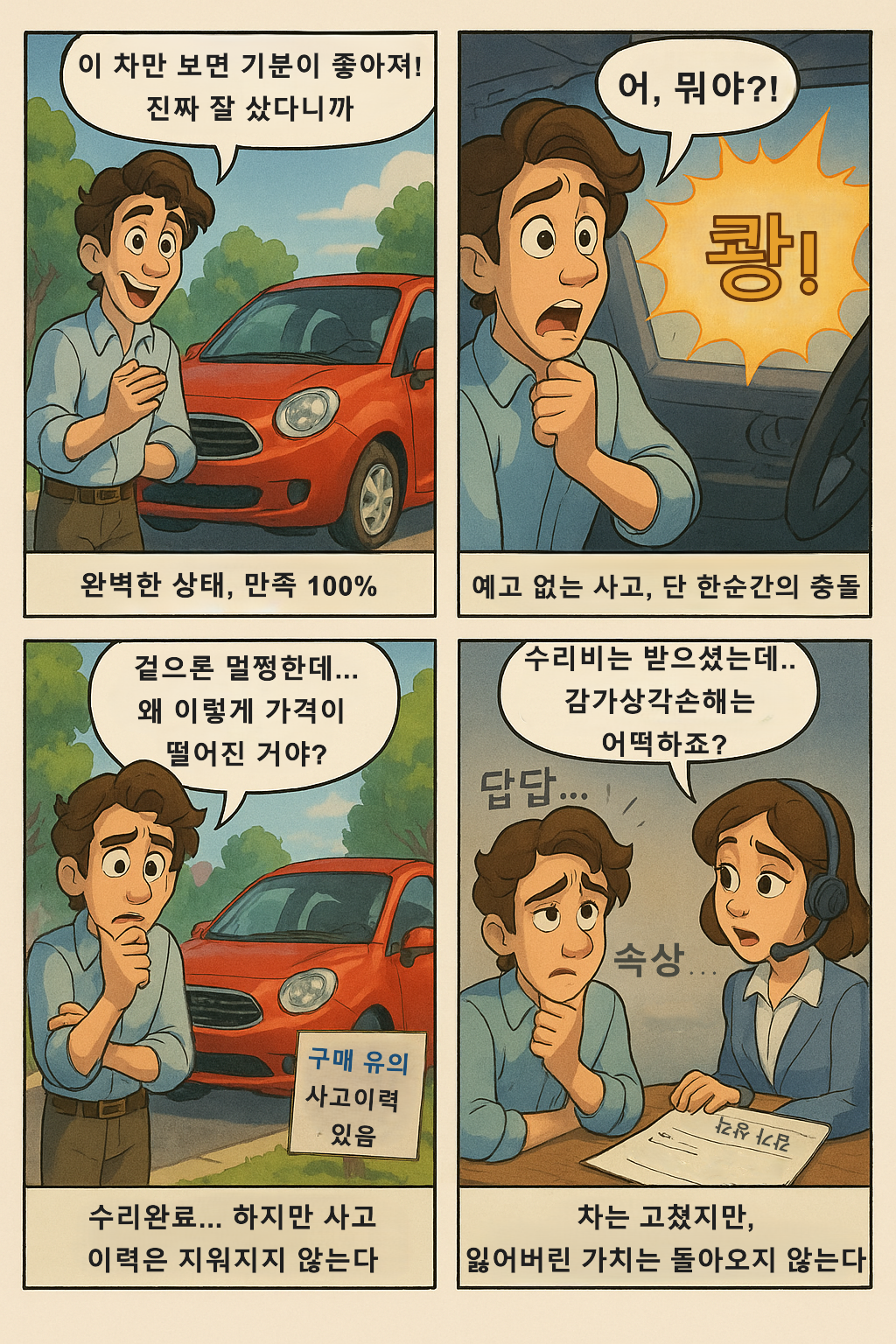자동차가 사고를 당하면 아무리 완벽하게 수리하더라도 사고 이력이 남아 차량의 시장 가치(중고차 가격) 가 떨어집니다.